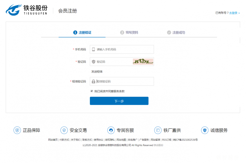 第二步:填寫手機號、驗證碼、短信驗證碼,勾選服務協議,點擊下一步