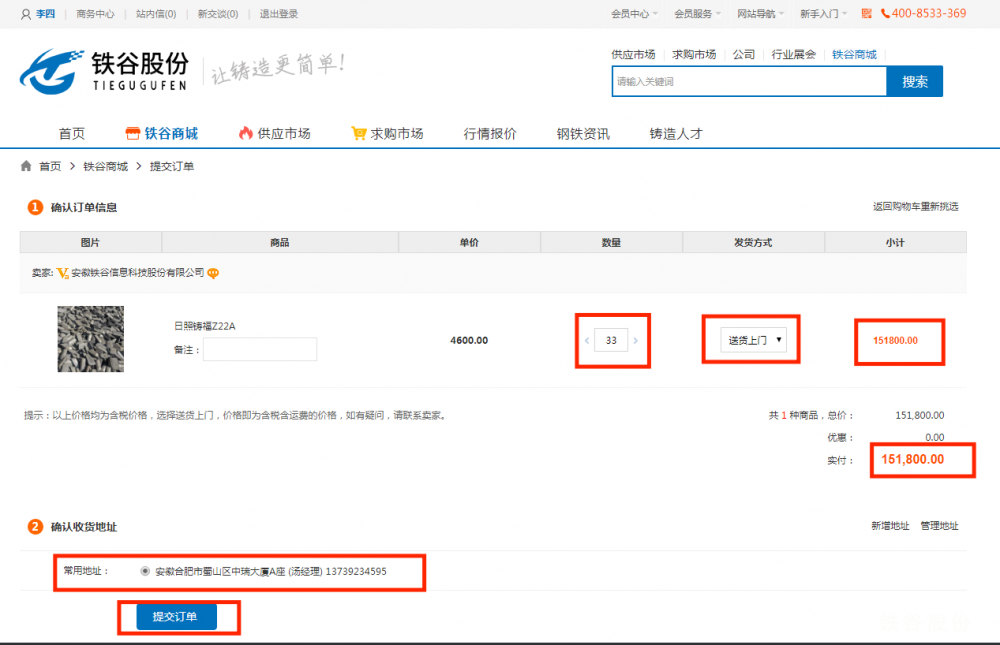 5、進入結算頁面后,確認發貨方式、價格、數量、總金額以及收貨地址后,點擊【提交訂單】。