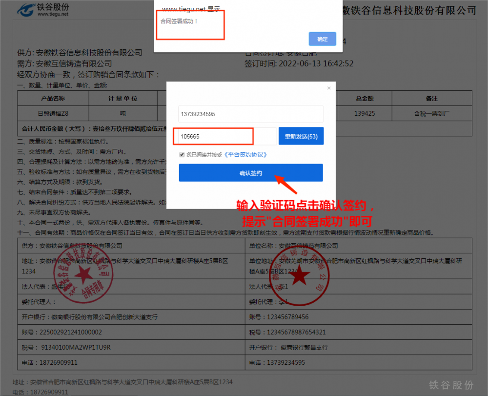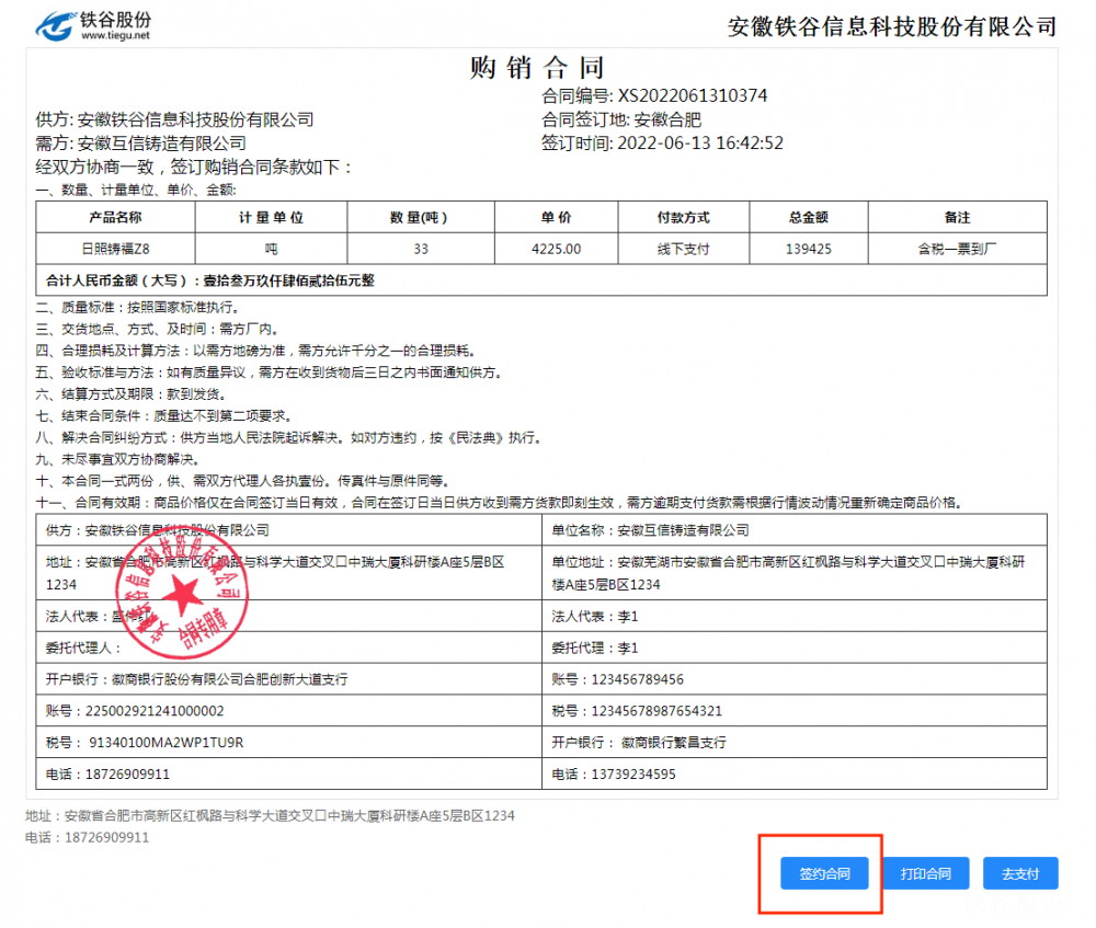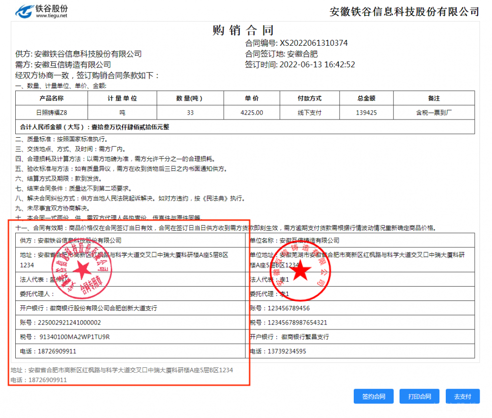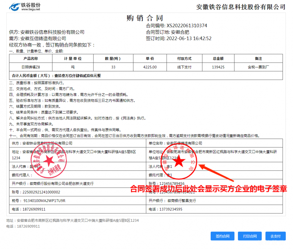 7、合同簽署成功后,選擇【去支付】進行支付結算環節,鐵谷平臺實行線上平臺采購下單,線下支付結算的方式,所以下一步需打印商戶支付信息,或根據合同上商戶的收款信息進行轉賬支付。