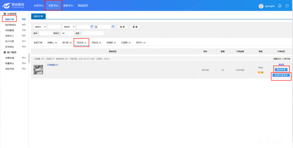 9、支付完成并上傳支付憑證確認完成支付后,采購下單流程即為結束,等待商家確認收款后發貨即可,買家可通過【我的訂單】查看物流信息及合同付款憑證。