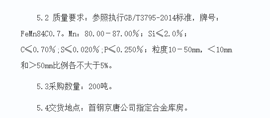 北京首鋼求購 低碳錳鐵 公開比選FeMn84C0.7