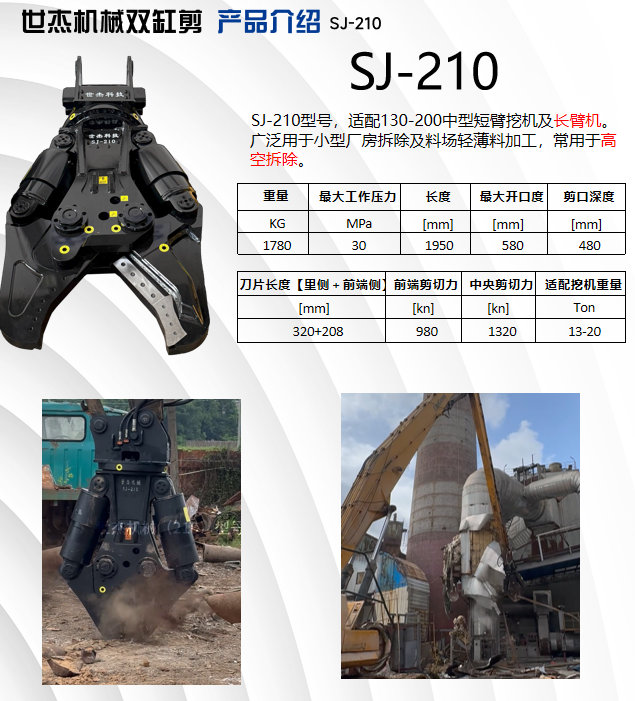 SJ-210型號,適配130-200中型短臂挖機及長臂機。廣泛用于小型廠房拆除及料場輕薄料加工,常用于高空拆除。