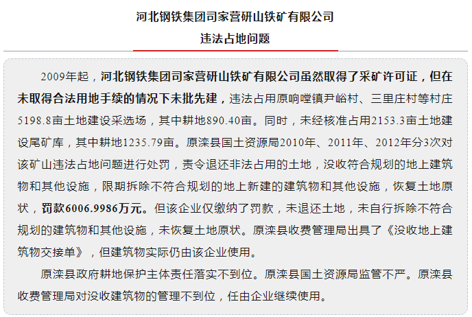 2023年國家自然資源督察機構開展例行督察發現,一些地方在2020年9月10日《國務院辦公廳關于堅決制止耕地“非農化”行為的通知》(國辦發明電〔2020〕24號)明確“六個嚴禁”后仍頂風侵占耕地挖湖造景、占用永久基本農田種植破壞耕作層的綠化裝飾草皮,一些地方政府及其部門非法批地、違法征地、主導推動違法占地,有些市縣“大棚房”問題反彈,補充耕地不實,侵占生態保護紅線違法占地建設、非法采礦;全國土地衛片執法發現,一些地區2022年以來違法占用耕地問題突出,且截至今年6月底仍未能整改落實到位,涉及耕地面積較大;國家自然資源督察機構開展例行督察和全國土地衛片執法還發現,有的地區2020年7月3日以后新增農村亂占耕地建房問題仍時有發生,有的截至今年6月底仍未能整改落實到位,涉及耕地面積較大,與新增農村亂占耕地建房“零容忍”的要求不相符。這些違法違規行為嚴重沖擊耕地保護紅線,危害國家糧食安全,破壞生態環境。 為嚴格保護耕地,嚴守生態保護紅線,督促各地堅決整改糾正違法違規問題,自然資源部決定集中公開通報56個違法違規重大典型問題。其中一例涉及鋼鐵相關,詳情如下: