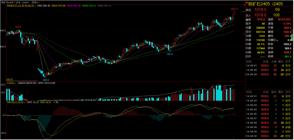 【宏觀方面】 國家開發銀行、中國進出口銀行、中國農業發展銀行凈新增抵押補充貸款(PSL)3500億元。 ACBNews《澳華財經在線》1月3日訊,鐵礦石巨頭FMG證實,一樁脫軌事件導致向西澳大利亞港口的鐵礦石供應量下降。 【供應方面】 據數據統計,上周澳洲巴西鐵礦發運總量2757.4萬噸,環比減少123.8萬噸,澳洲發運量1811.9萬噸,環比減少210.2萬噸,其中澳洲發往中國的量1565.4萬噸,環比減少165.8萬噸。巴西發運量945.5萬噸,環比增加86.4萬噸。供應小幅回落,但仍處于高位。 【需求方面】 據數據統計,上周日均鐵水產量221.28萬噸,環比上周減少5.36萬噸,鐵水產量延續季節性下滑趨勢,目前鋼廠虧損擴大,采購較為謹慎,但假期歸來,鋼廠仍有補庫和冬儲預期,需求有支撐,鋼材消費進入淡季,五大材產量季節性下降,鐵水下滑趨勢仍在延續,需求支撐會慢慢削弱。 【庫存方面】 據數據統計,上周在港船舶數量下降25艘至123艘,疏港量也降至300萬噸以下,接近兩個月低位,國內45港進口礦庫存周環比增加104.97萬噸或0.88%至1991.73萬噸,續創3個半月新高,盡管周內外礦到港量有所下降,但壓港資源大幅釋放。 【宏觀方面】 【檢修方面】 多家鋼廠開始檢修,山東萊鋼永鋒鋼鐵2座轉爐輪流停產,每座轉爐停半個月,2座高爐休風一個月,產線減產,日均影響產量0.7萬噸。檢修以后每日軋材產量0.8萬噸。六安鋼鐵于1月2日開始對2#轉爐進行檢修,預計檢修時間13天,日均影響產量0.5萬噸。浙江譽鑫將于1月4日停產預計復產時間2月26日,日均影響產量0.3萬噸。 【現貨方面】 1月3日,鐵礦石品種基差整體收窄,主流品種中河鋼精粉基差最大,為273.0,較上一工作日收窄20.0;PB粉48.0(-3.0);金布巴粉2.0(-4.0);超特粉-72.0(-1.0)。(單位:元/噸) 1月3日,鐵礦石即期進口利潤漲跌互現,主流品種中揚迪粉進口利潤最高,為10.1,較上一工作日下跌9.8;紐曼塊進口利潤最少,為-37.7(-9.6);PB粉進口利潤為-22.7(-2.7)。(單位:元/噸) 1月3日,鐵礦石交割利潤漲跌互現,其中最優交割品為鞍鋼精粉,其交割利潤為-71.6,較上一工作日上漲13.9;PB粉為-103.5(+1.1);金布巴粉為-101.6(+2.6);超特粉為-163.5(-1.2)。(單位:元/噸) 【期貨方面】 周三鐵礦石主力合約早盤強勢上漲,午收1018.5元/噸,漲2.93%;盤中最高觸及1025.5元/噸,最低999元/噸,回踩了千元整數大關支撐,午后收盤漲幅超3%,上漲30元,整體高位強勢運行,均價線多頭排列短期封死下跌通道,成交量溫和放大,DIF與DEA交叉向上,RSI三線指標位于61-68,向布林帶上軌運行。價格再次創新高,上方阻力1060元/噸,下方支撐1000元/噸,整體價格偏強運行,操作上以布局多單為主。 【后市方面】 鐵礦石需求呈現季節性減弱特征,但宏觀政策增量預期以及鐵礦石存在剛需,冬季鋼廠原料補庫將進一步增加鐵礦石需求,鐵礦石巨頭FMG證實,一樁脫軌事件,供應可能造成影響,短期鐵礦石易漲難跌,操作上以布局多單為主,不建議繼續追高,鐵礦短期或將偏強運行。