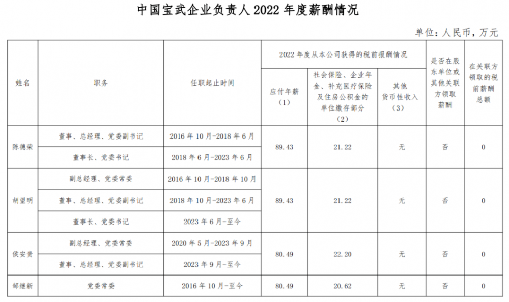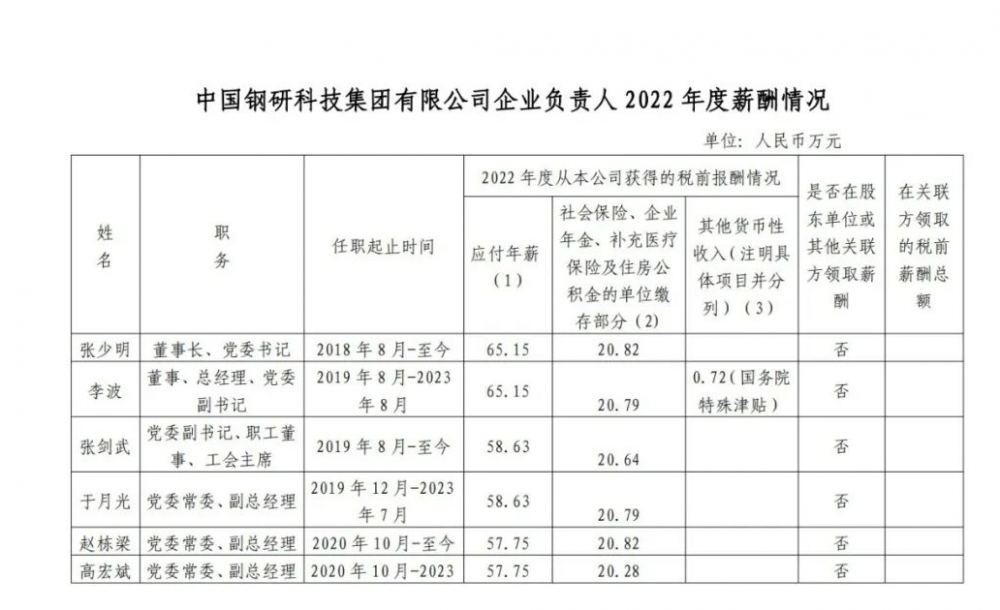中國寶武 作為全球最大的鋼鐵企業(yè)之一,中國寶武鋼鐵集團(tuán)有限公司負(fù)責(zé)人的年薪自然也是大家關(guān)注的焦點。根據(jù)數(shù)據(jù),2022年度中國寶武鋼鐵集團(tuán)有限公司薪酬最高的是時任董事長、黨委書記陳德榮和總經(jīng)理胡望明,兩者的應(yīng)付年薪均為89.43萬元。 鞍鋼集團(tuán) 鞍鋼集團(tuán)有限公司作為我國的老牌鋼鐵企業(yè),其領(lǐng)導(dǎo)層的年薪也備受關(guān)注。根據(jù)國資委公布的數(shù)據(jù),2022年度鞍鋼集團(tuán)有限公司薪酬最高的是黨委書記、董事長譚成旭和時任總經(jīng)理戴志浩,應(yīng)付年薪均為82.11萬元。 新興際華集團(tuán) 新興際華集團(tuán)有限公司是我國的大型央企之一,其負(fù)責(zé)人的年薪也備受關(guān)注。根據(jù)數(shù)據(jù),2022年度新興際華集團(tuán)有限公司黨委書記、董事長賈世瑞的應(yīng)付年薪為65.74萬元。 中國五礦集團(tuán) 中國五礦集團(tuán)有限公司作為我國的大型央企之一,其負(fù)責(zé)人的年薪也備受關(guān)注。根據(jù)數(shù)據(jù),2022年度中國五礦集團(tuán)有限公司黨組書記、董事長翁祖亮和總經(jīng)理國文清的應(yīng)付年薪均為90.71萬元。 中國鋼研科技集團(tuán) 中國鋼研科技集團(tuán)有限公司是我國鋼鐵行業(yè)的龍頭企業(yè)之一,其負(fù)責(zé)人的年薪自然也是大家關(guān)注的焦點。根據(jù)數(shù)據(jù),2022年度中國鋼研科技集團(tuán)有限公司董事長、黨委書記張少明和時任總經(jīng)理李波的應(yīng)付年薪均為65.15萬元。 總的來說,五大鋼鐵央企領(lǐng)導(dǎo)層的年薪水平各有千秋,但都與企業(yè)的規(guī)模、業(yè)績等因素緊密相連。我們期待這些企業(yè)能夠繼續(xù)保持穩(wěn)定的發(fā)展態(tài)勢,為國家經(jīng)濟(jì)做出更大的貢獻(xiàn)。同時,也希望央企的薪酬制度能夠更加公正、透明,激發(fā)企業(yè)負(fù)責(zé)人的工作積極性,推動我國鋼鐵行業(yè)的持續(xù)健康發(fā)展。