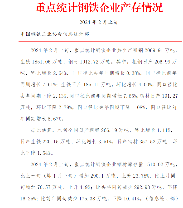 核心提示:2024年2月上旬重點(diǎn)統(tǒng)計(jì)鋼鐵企業(yè)產(chǎn)存情況