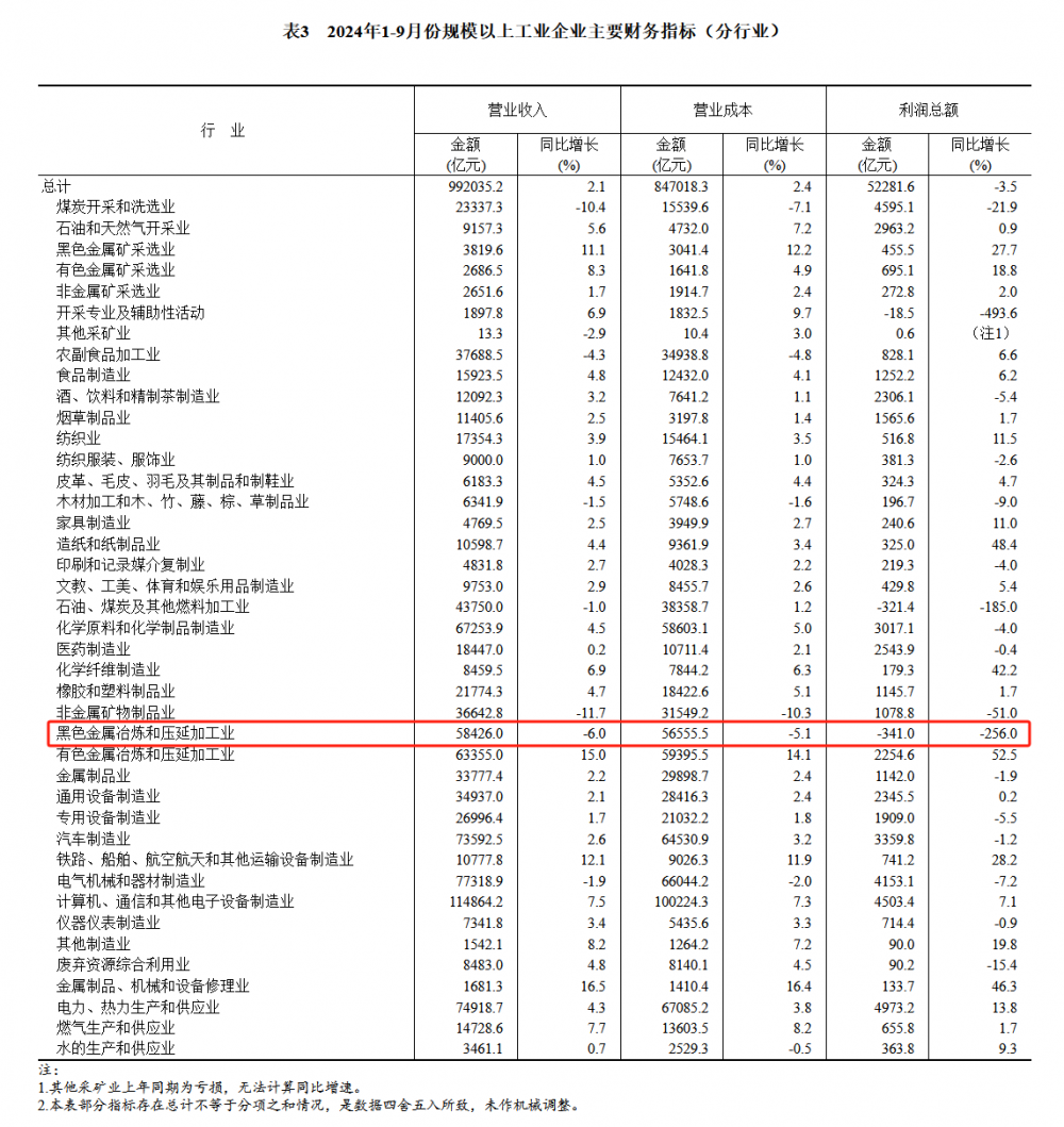 1-9月份,黑色金屬冶煉和壓延加工業(yè)利潤總額虧損341億元。