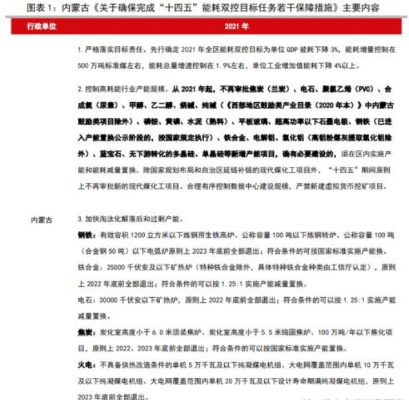 2021年2月7日發改委發布了各地區2019年能耗消費總量和強度雙控目標考核結果,公告通報批評了內蒙古自治區(唯一)未完成雙控任務。內蒙古政府隨即于2月10日召開內蒙古雙控新聞發布會,先行確定2021年全區單位地區生產總值能耗降低3%,能耗增量控制在500噸標準煤以內的目標,并表示要制定“一攬子”政策體系。3月9日,內蒙古印發《關于確保完成“十四五”能耗雙控目標任務若干保障措施》,明確要求: