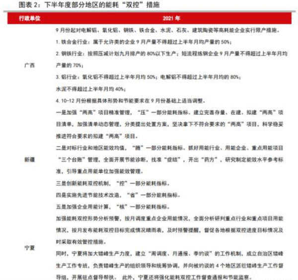 無獨有偶,8月17日被預警的部分省份,也隨即就“雙控”予以表態。廣西省出臺了新的雙控措施,要求從九月份開始,對電解鋁、氧化鋁、鋼鐵、水泥等高耗能企業實行限產,并給出了明確的減產標準。新疆、寧夏等被警告的自治區也做了整改部署。這些措施將在下半年對產品產生重大影響。