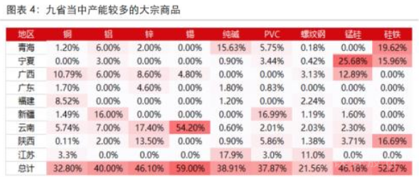 發改委指出對于能耗強度降低預警等級為一級的省(區),即青海、寧夏、廣西、廣東、福建、新疆、云南、陜西、江蘇這九個省,2021年將暫停“兩高”項目節能審查。對于能源消費總量預警的省(區),發改委并未采取措施,意味著現階段而言能耗強度降低是更為緊急的任務。通過梳理這九個省主要工業品的產能占比可以發現,有色金屬、鐵合金、PVC和純堿將受到較大影響,根據這九省產能占比排序,影響排序如下:鐵合金>;有色>;純堿>;PVC>;螺紋鋼。