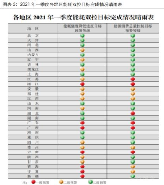 8月17日發改委印發了《2021年上半年各地區能耗雙控目標完成情況晴雨表》,從能耗強度降低情況看,今年上半年,青海、寧夏、廣西、廣東、福建、新疆、云南、陜西、江蘇9個省(區)能耗強度同比不降反升,10個省份能耗強度降低率未達到進度要求,全國節能形勢十分嚴峻。文件要求,能耗強度不降反升的9省(區),對所轄能耗強度不降反升的地市州,今年暫停國家規劃布局的重大項目以外的“兩高”項目節能審查,并督促各地采取有力措施,確保完成全年能耗雙控目標特別是能耗強度降低目標任務。