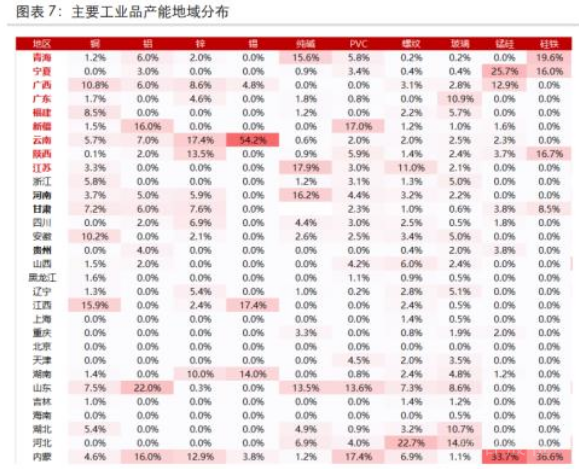 雙控政策主要針對高能耗行業,需要關注的高能耗行業主要有六類,分別是:化學原料及化學制品制造業、黑色金屬冶煉及壓延加工業、有色金屬冶煉及壓延加工業、非金屬礦物制品業、石油加工煉焦及核燃料加工業、電力熱力的生產和供應業。對應到上市期貨上,主要有純堿、PVC、螺紋鋼、鐵合金、有色金屬、玻璃、焦炭等,我們總結了上述期貨的產能地域分布情況。