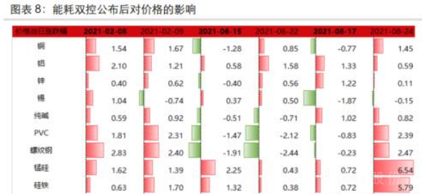 在8月17日《2021年上半年各地區能耗雙控目標完成情況晴雨表》印發后,由于鐵合金與有色金屬在9省當中產能占比較高,鐵合金與有色金屬在當日及后期漲勢明顯強于其他品種。螺紋鋼與PVC雖然受制于國內經濟下滑在當日有所下跌,但是在之后一周內便迅速回歸漲勢,總體還是受益于能耗雙控的供給端壓制。