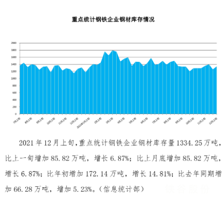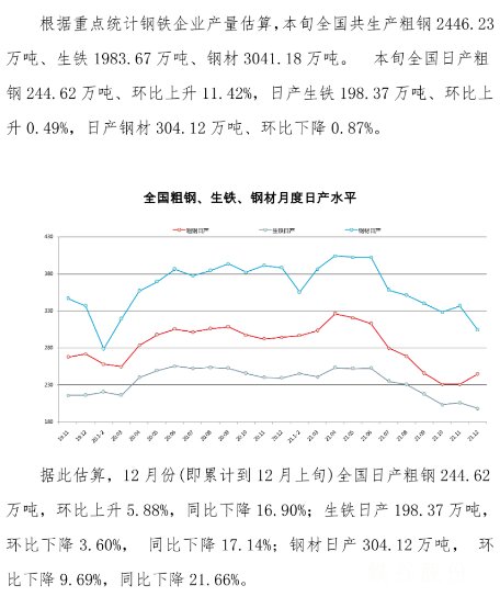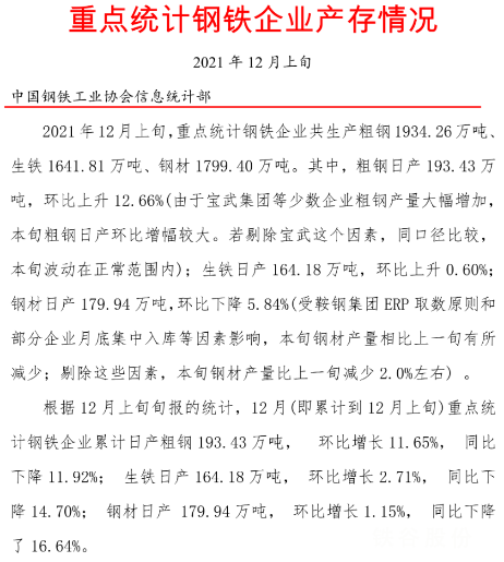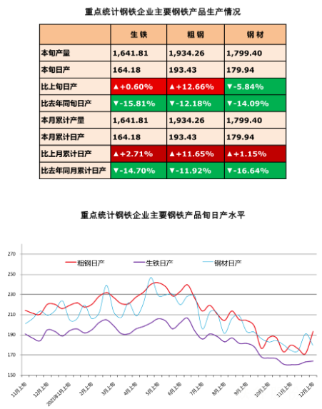 2021年12月上旬,重點(diǎn)統(tǒng)計(jì)鋼鐵企業(yè)共生產(chǎn)粗鋼1934.26萬噸、生鐵1641.81萬噸、鋼材1799.40萬噸。其中,粗鋼日產(chǎn)193.43萬噸,環(huán)比上升12.66%;生鐵日產(chǎn)164.18萬噸,環(huán)比上升0.60%;鋼材日產(chǎn)179.94萬噸,環(huán)比下降5.84%。