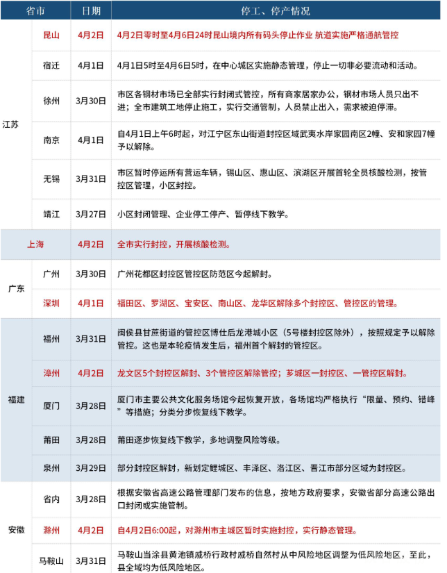 截至4月2日,據不完全統計,共有16個省份發布了停工復工最新信息。其中,上海全市實行封控,開展核酸檢測。深圳福田區、羅湖區、寶安區、南山區、龍華區解除多個封控區、管控區的管理。吉林省"無疫小區"可根據疫情形勢降級管控或優先解封有序放開社會面;琿春市所有封控區、管控區全部解封解控。具體情況如下: