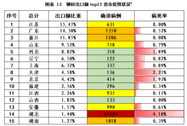 我國4大鋼鐵出口省份疫情嚴峻,出口貿易恐受重創。從圖表13可以看出,江蘇、廣東、浙江和山東是我國鋼鐵出口前4大省份,出口額合計占我國鋼鐵總出口額的51.14%,而這四個省份的疫情非常嚴峻,省內人員流動限制加強、復工復產難度增大,相較于其他省市,這四個省市鋼鐵貿易受影響增大,可能導致我國鋼鐵出口總量明顯下降。此外,已簽約訂單因為復工延遲企業人手不夠、交通限制較大,恐或面臨不能如期交貨等違約風險。