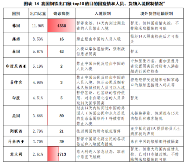 境內境外運輸受阻,鋼鐵出口不暢影響交貨期。前文介紹了疫情期間因國內多地采取不同程度的交通管制,鋼鐵產品外運受到嚴重阻礙,對于鋼鐵出口企業來說,受交通運輸影響更為嚴重。鋼鐵出口國內需要依靠公路和鐵路運輸,境外主要依靠船舶。目前由于國內公路運輸受限制,我國鋼鐵出口主要依靠鐵路運輸,但一時間增加大量運輸任務,造成鐵路運輸擁堵,交貨期難以保證。港口雖然目前正常作業,但效率降低,影響交貨期。隨著疫情的擴大,各國陸續增設中國船舶入境檢疫程序、限制入港(入港前隔離14天)程序等(見圖表14),造成船舶非常規性停泊時間延長,流程將變得極其復雜。如遇異常情況,比如船員出現發燒或疑似病癥,人員被隔離,所涉船舶也將大概率被取消靠泊。特別是部分國家開始關閉邊境、通關口岸,出口報關困難,海運費暴漲的可能性很大。