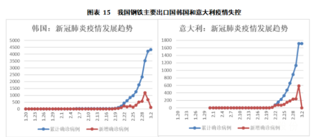 對比中國疫情發展進程,2月24日的韓國和意大利的疫情態勢相當于1月24日的中國(1月20日-24日,我國確診病例增長4.7倍)。在過去1個月里,我國鋼鐵下游產業已經受到一定程度的沖擊,而未來1個月甚至更長時間,韓國和意大利鋼鐵下游產業也將受到不同程度的負面影響,對鋼鐵需求也將下滑,從我國進口鋼鐵的數量也會下降。考慮到新冠肺炎潛伏期長達14天之久,在韓國和意大利疫情爆發前的14天內,兩國對其非中國公民出入境限制較少,本國公民出入境限制也較少,疫情蔓延很有可能波及到周邊國家以及貿易往來密切的國家,即很有可能波及到亞洲和歐洲——我國鋼鐵出口的兩大主要洲別。如果這些國家疫情防控失利,將對我國鋼鐵出口貿易產生不可估量的影響。
