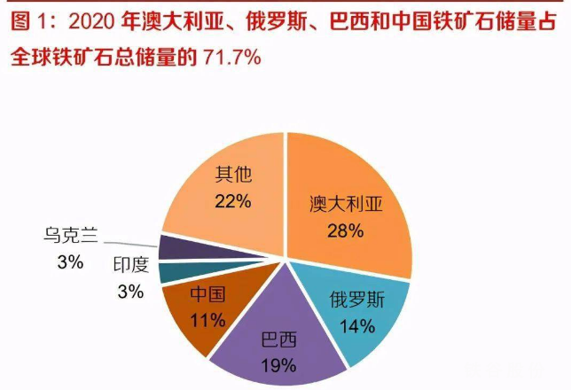 從儲量來看:2020年全球鐵礦石儲量1800億噸,澳大利亞、巴西、俄羅斯和中國合計占比71.7%。根據 USGS 統計,以上國家鐵礦石儲量分別為 500 億、340 億噸、250 億噸和 200 億噸,分別占 世界總儲量的 27.8%、18. 9%、13.9%和 11.1%。另外,印度、烏克蘭和加拿大等國家鐵礦石資源 也較為豐富。