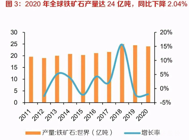 從產量來看:2020 年全球鐵礦石產量達 24 億噸,澳大利亞、巴西、印度、中國、俄羅斯產量占比 82%。根據 USGS 統計,2020 年全球鐵礦石產量達 24 億噸、同比降低 2.04%,主要集中在澳大 利亞、巴西、印度、中國、俄羅斯五國,分別占全球鐵礦石總產量的 37.5%、16.7%、9.6%、14.2% 和 4.0%,合計占比達 82%。