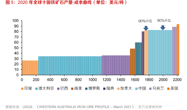 從各個國家鐵礦石平均成本來看:澳大利亞、巴西產量高且成本優勢突出,全球鐵礦石成本曲線的 80%和 90%分位集中在中國鐵礦石成本位附近。根據 Government of Western Australia 發布的 《WESTERN AUSTRALIA IRON ORE PROFILE – March 2021》,2020 年 CFR 現金成本前五 的國家為印度、澳大利亞、巴西、南非、俄羅斯,其 CFR 現金成本分別為 26.7、34.5、36.0、48.6、 60.0 美元/噸,中國 CFR 現金成本為 82.8 美元/噸。再結合 USGS 統計的 2020 年產量數據,我們 做出產量-成本曲線如下:全球鐵礦石成本曲線的 80%和 90%分位集中在中國鐵礦石成本位附近。
