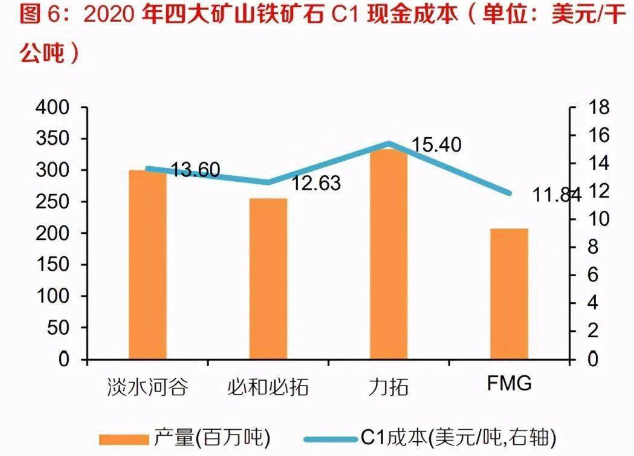 從主流礦山 62%CFR 現金成本來看,四大礦山為 21.06-30.78 美元/干公噸。我們將四大礦山公 布的 C1 現金成本換算為 62%品位時的 CFR 現金成本,計算公式為 62%CFR 現金成本(美元/干 公噸)=(C1*(1+資源稅率)+運價)*(1-含水量)*(62%/平均品位)。根據公司公告和 Wind 統計數據,我們計算得到淡水河谷、必和必拓、力拓、FMG 2020 財年 62%CFR 現金成本分別 為 30.78、21.34、22.11、21.06 美元/干公噸。