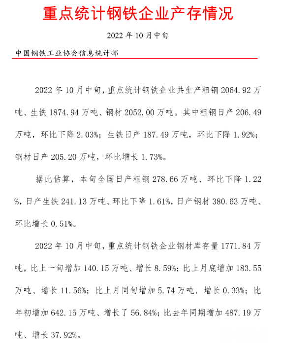 2022年10月中旬,重點統計鋼鐵企業共生產粗鋼2064.92萬噸、生鐵1874.94萬噸、鋼材2052.00萬噸。其中粗鋼日產206.49萬噸,環比下降2.03%;生鐵日產187.49萬噸,環比下降1.92%;鋼材日產205.20萬噸,環比增長1.73%。