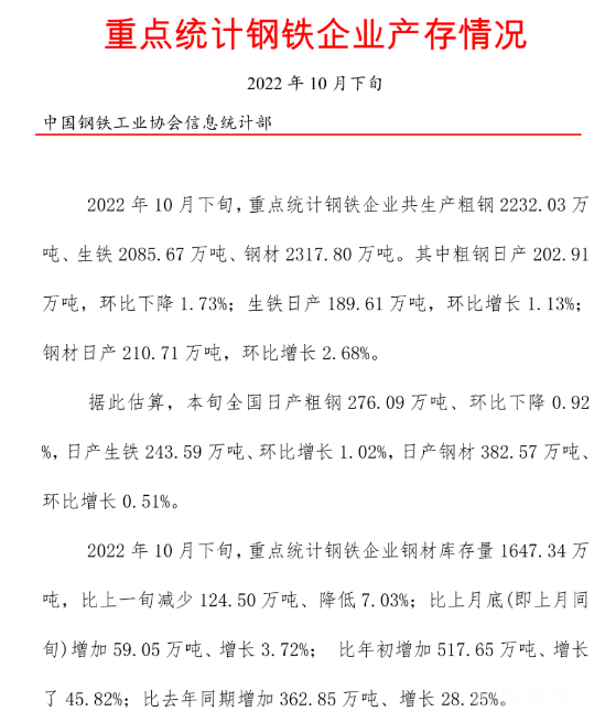 2022年10月下旬重點統計鋼鐵企業產存情況