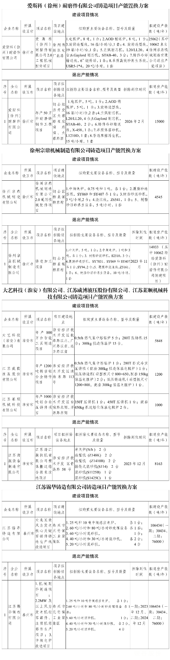 按照《國務院關于印發打贏藍天保衛戰三年行動計劃的通知》(國發〔2018〕22號)、《工業和信息化部辦公廳 國家發展和改革委員會辦公廳 生態環境部辦公廳關于重點區域嚴禁新增鑄造產能的通知》(工信廳聯裝〔2019〕44號)要求,現將愛斯科(徐州)耐磨件有限公司等6家企業鑄造項目產能置換方案予以公示,歡迎社會公眾進行監督。公示期為2023年2月14日至2023年2月20日。如有異議,請在公示期內以書面形式向江蘇省工業和信息化廳反映情況。聯系電話:025-69652741(業務咨詢)、025-69652843(信訪舉報)。