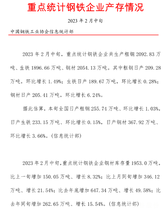 2023年2月中旬,重點統計鋼鐵企業共生產粗鋼2092.83萬噸、生鐵1896.66萬噸、鋼材2054.13萬噸。其中粗鋼日產209.28萬噸,環比增長1.49%;生鐵日產189.67萬噸,環比增長0.28%;鋼材日產205.41萬噸,環比增長6.24%。2023年2月中旬,重點統計鋼鐵企業鋼材庫存量1953.0萬噸,比上一旬增加150.05萬噸、增長8.32%;比上月同旬增加346.12萬噸、增長21.54%;比去年底增加647.34萬噸、增長49.58%;比去年同旬增加262.65萬噸、增長15.54%。