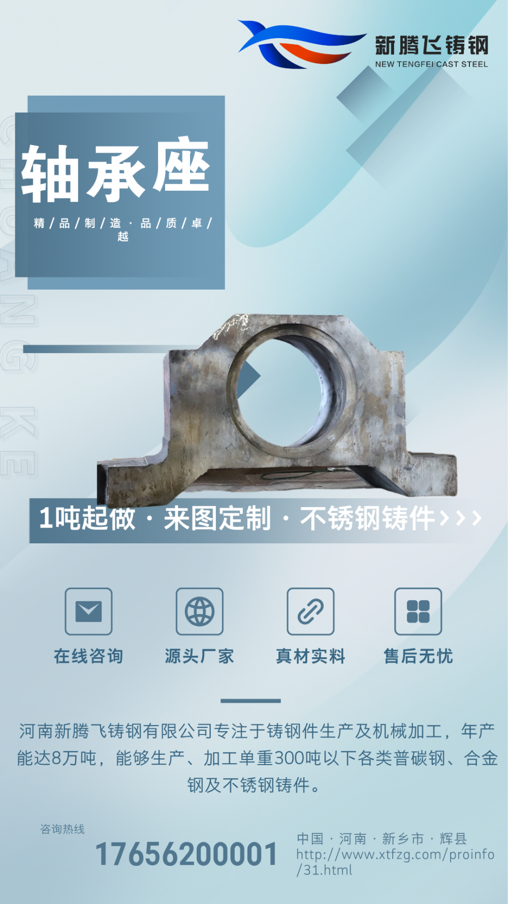 軸承座是固定軸承、球磨機等設備的重要部件,主要承載著筒體整個重量和沖擊力,在整個軸承構件中起到支架的作用。有軸承的地方就需要支撐點,軸承的內支撐點是軸,外支撐就是軸承座。 軸承座是在低速重載并伴有沖擊的環境中長時間運行,因此要有較高的強度和耐磨性,并要求具有一定的減震性能。