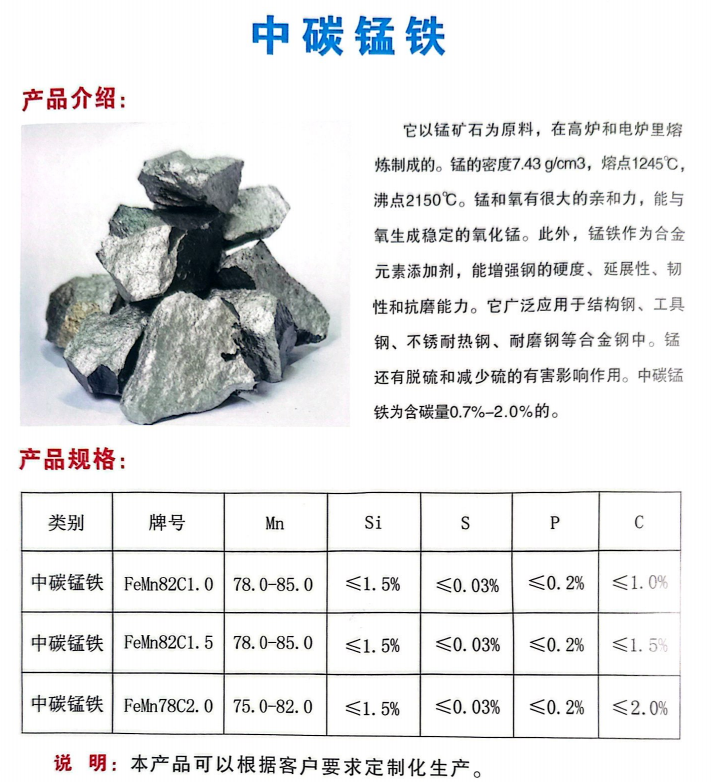 低碳錳鐵和中碳錳鐵,主要是由錳、鐵兩種元素組成的合金,它以錳礦石為原料,在高爐和電爐里熔煉制成,是煉鋼生產中用得較多的一種脫氧劑和合金化材料。